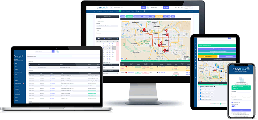 CareLink is a powerful practice management tool specifically designed to meet the needs of mobile medical providers. CareLink provides best in class map based patient scheduling tools. CareLink also can provide a direct a link between patient's care givers, assisted living homes, group homes, doctors’ offices, and others who are managing the care of a large group of patients within your practice. CareLink can be integrated directly with most popular EMRs.