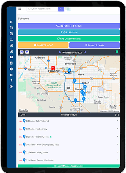 Use the built in powerful map based scheduling tools to optimize patient scheduling. Minimize your provider driving time and increase the amount of time you spend on patient care.